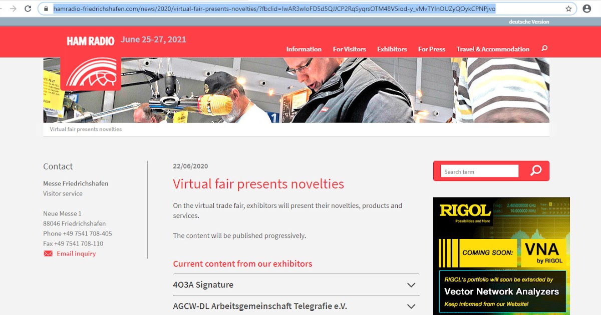 Neue Messe 1 88046 Friedrichshafen Phone +49 7541 708-307 Fax +49 7541 708-331 Email inquiry . Press Releases International Amateur Radio Exhibition in Friedrichshafen from June 24 to 26, 2022 - Live radio contact with surprise guest during the exhibition - Still time to register