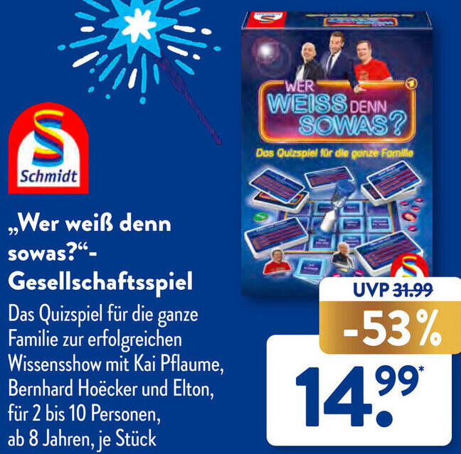 SCHMIDT „Wer weiß denn sowas?" Gesellschaftsspiel. ALDI SÜD Schmidt Spiele Gesellschaftsspiele. Angebot ist nicht mehr aktuell. Produkt bei OTTO suchen. Produkt bei Amazon suchen. Dieser Artikel war bis zum 30.12.2023 nur in der Filiale im Angebot. ALDI SÜD Filialen.